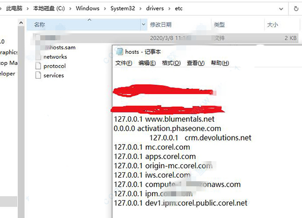 3、编辑HOSTS文件,添加下面的规则禁止程序连网验证