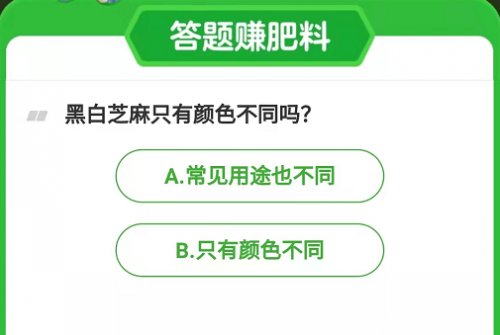 黑白芝麻只有颜色不同吗?这是淘宝芭芭农场的农场百科问答中的一题,答对了就可以获得农场肥料,很多小伙伴不知道正确的答案是什么,下面就一起来看看吧。