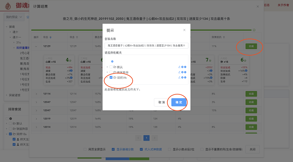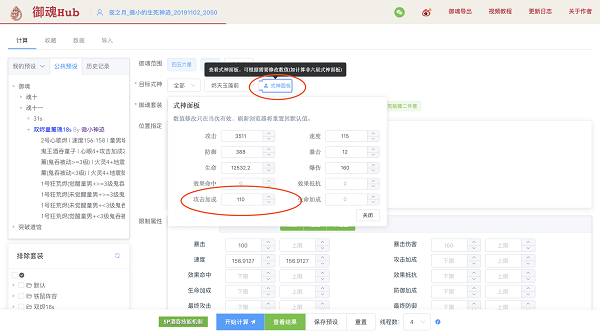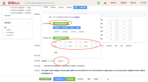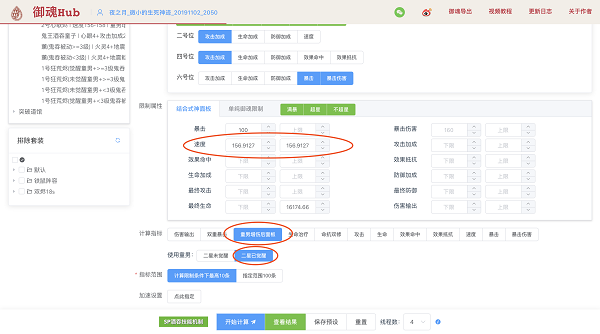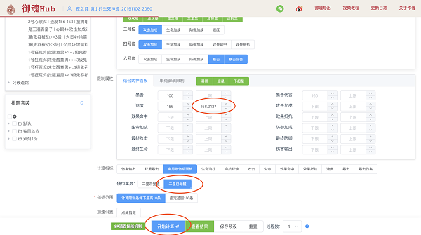 再把下图的速度上下限都设置成刚才的速度,这样可以精确找到同一套御魂,并且注意把计算指标改成下图红圈所示的 童男增伤面板-觉醒童男