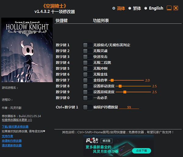 空洞骑士十一项修改器 v1.4.3.2下载 风灵月影版