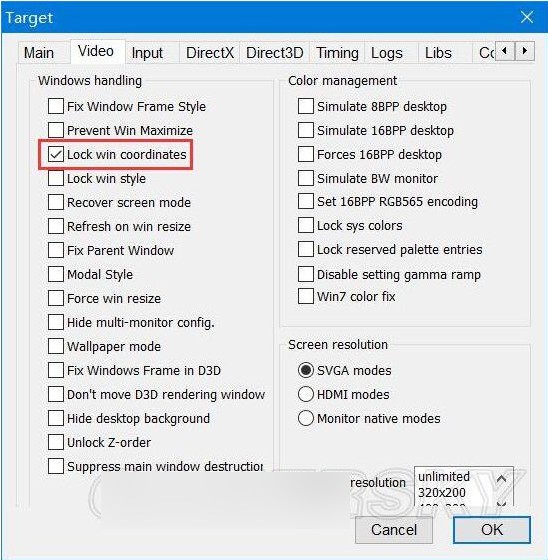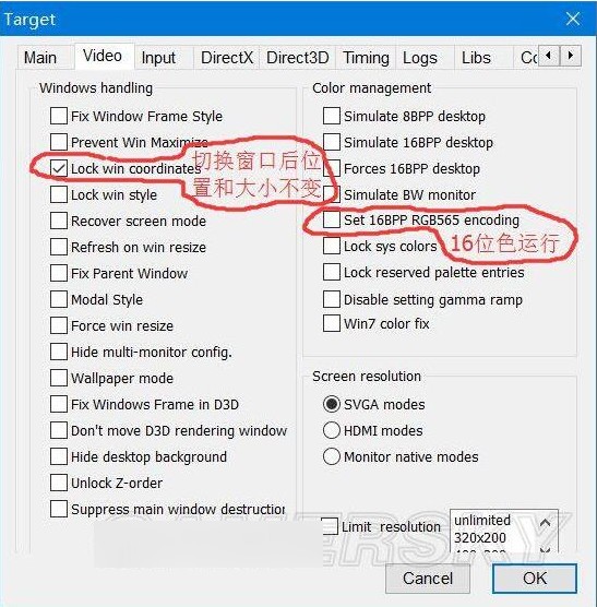 “Lock win coordinates”建议所有游戏都勾上,不然切换到别的窗口后再切回游戏窗口会变为游戏默认分辨率大小;如果游戏花屏则需要勾上16位色运行,仙剑系列只有仙二要勾上。