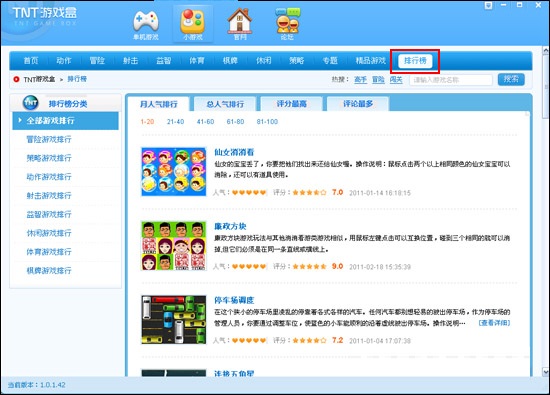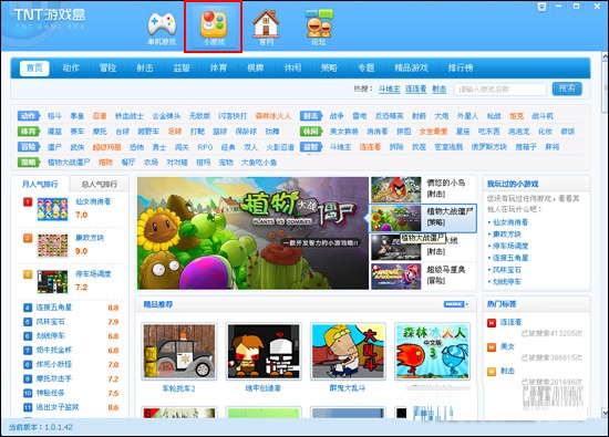 TNT游戏盒是一款小游戏集合工具,2000款单机游戏免费下载,更多游戏资源陆续添加中。独创的游戏下载告诉通道,让你的下载速度健步如飞。所有游戏都经过编辑一一安装测试,杜绝病毒、木马威胁。独特的树状游戏管理模块,让您较快速的使用。