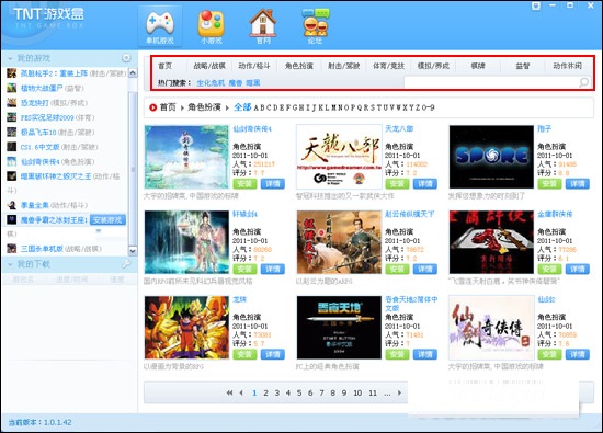 3、进入TNT游戏盒以后,用户可以通过主界面上方的游戏分类来查找你喜欢的游戏类型,TNT游戏盒为用户提供了2000款单机游戏,只需轻松一点,实现游戏的下载、安装、运行,减少用户麻烦,节省玩家时间。。