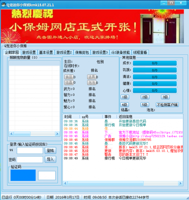 在QQ上养宠物的时候,没有必要总是看着呢。qq宠物帮助自动饲养宠物,自动洗澡,自动注册等,想让自己的宠物快速成长,用q宠物迷你保姆比较好。以上内容由光行资源网整理提供!软件截图
