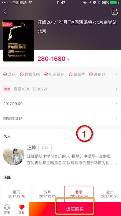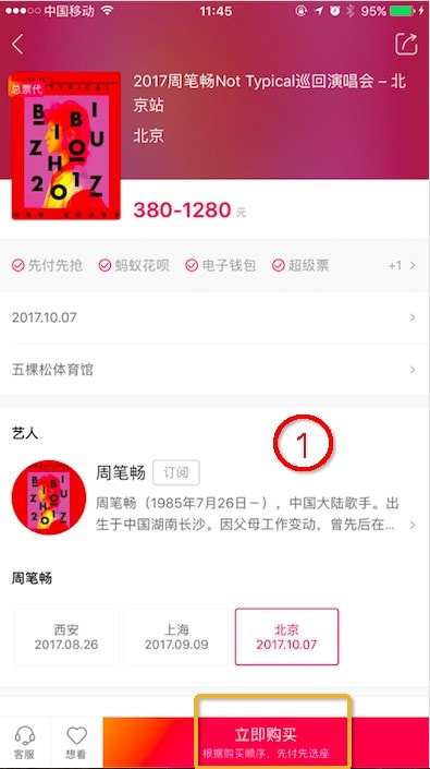 下单订票功能:选择好演出项目,选择订票方式:立即购买