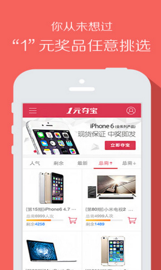 一元夺宝手机安卓版是一个十分受大家喜爱的购物平台,服务平台内产品所有是真品正品,客户只需应用1块钱对自已感兴趣的产品实现选购就会有很有可能获得该产品哦,得奖概率十分大,热烈欢迎诸位有兴趣的朋友免费下载应用。