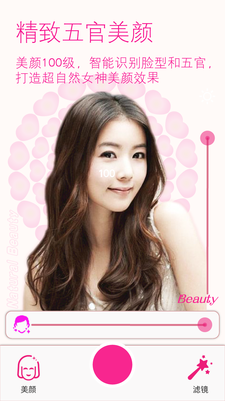1、精致的五感美颜:美颜100级智能识别你的脸型和五感,为你创造超自然的女神美颜效果。