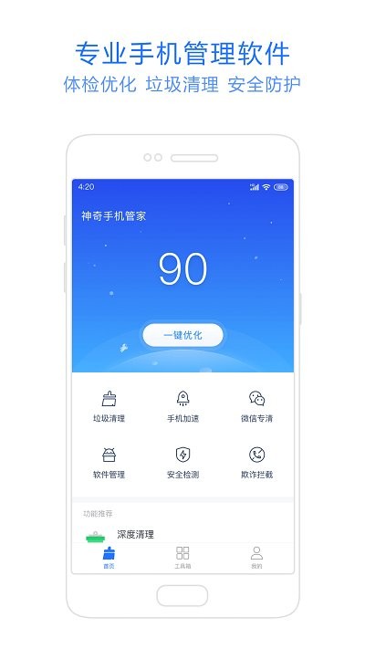 �����ֻ��ܼ�app��һ��רҵ���õ��ֻ����ֹܼ�����������ʮ��ǿ��Ĺ��ܣ���������Ч�����ֻ��е�������һ��������죬���ܰ�����ټ���ֻ��е������Լ��������Ż��ֻ�ϵͳ���ͷŸ�����ڴ�ռ䣬������ֻ����г�ͨ���衣
