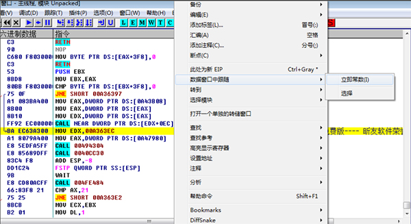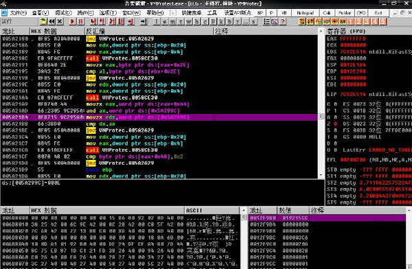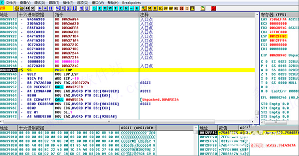 数据格式:OllyDbg 的数据窗口能够显示的所有数据格式:HEX、ASCⅡ、UNICODE、 16/32位有/无符号/HEX整数、32/64/80位浮点数、地址、反汇编(MASM、IDEAL或是HLA)、PE文件头或线程数据块。