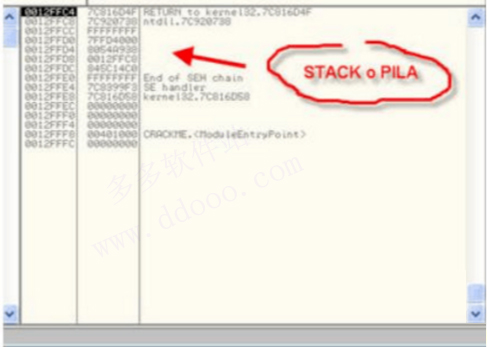 默认情况下,它显示ESP寄存器指向的信息(也是最重要的),但是你可以改变它的显示模式来显示来自涉及EBP的信息。这需要在这个窗口上点击右键,选择GO to EBP。再次点击右键选择Go to ESP,回到先前窗口。