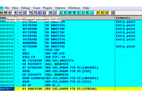 1、Ctrl+F2 - 重启程序,即重新启动被调试程序。如果当前没有调试的程序,OllyDbg会运行历史列表[historylist]中的第一个程序。程序重启后,将会删除所有内存断点和硬件断点。译者注:从实际使用效果看,硬件断点在程序重启后并没有移除。