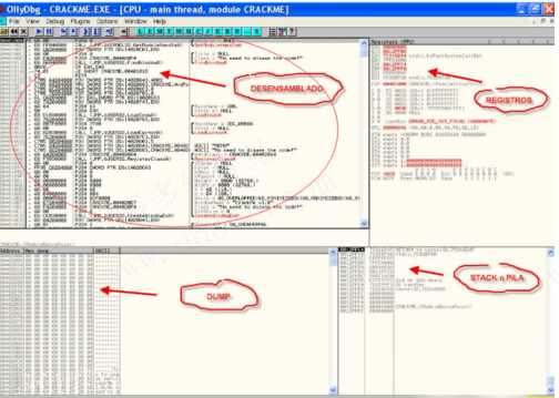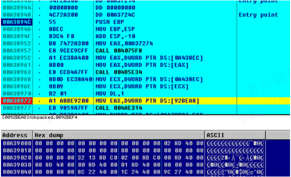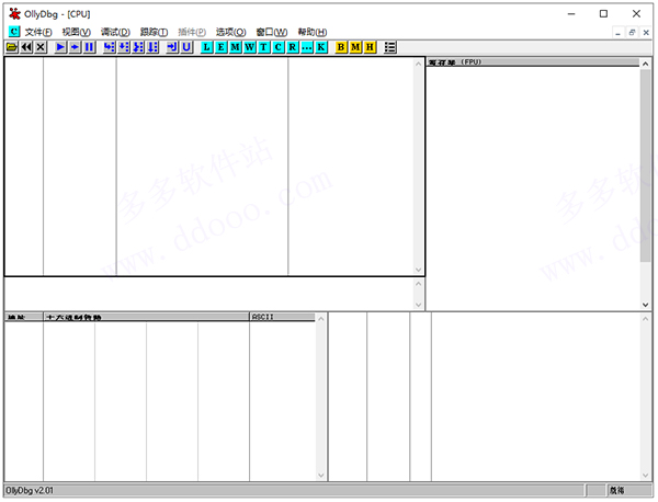 ollydbg(od反汇编工具)在这里显示反汇编代码,我们将要以OllyDbg的默认配置调试分析你打开的程序。 调试选项可以在Options-Debugging options里更改。