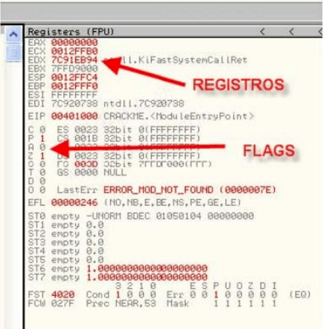 第二个重要的窗口——寄存器窗口。看一下这个在OllyDbg最右边的窗口,它出现了很多信息。