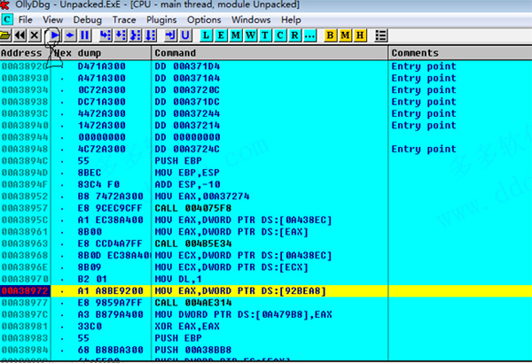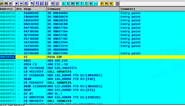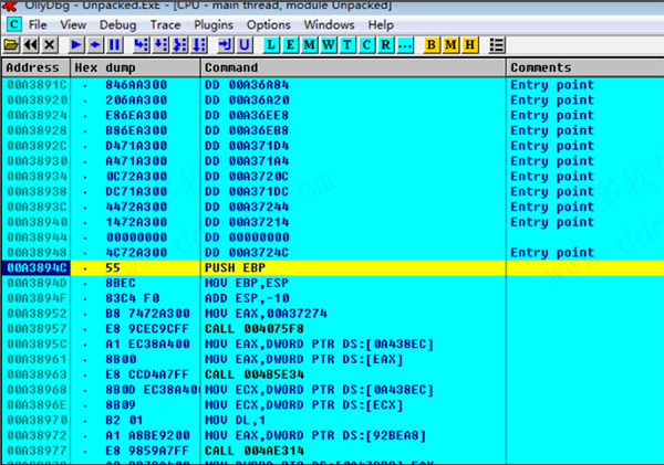 OllyDbg的反汇编器可以高亮不同类型的指令(如:跳转、条件跳转、入栈、出栈、调用、返回、特殊的或是无效的指令)和不同的操作数(常规[general]、FPU/SSE、段/系统寄存器、在栈或内存中的操作数,常量)。您可以定制个性化高亮方案。