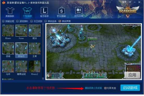 点击"英雄换肤" 标签,即可查看到英雄换肤界面,左边显示了所有英雄的头像,当鼠标点击任意一个头像,右边则对应显示出该英雄可用的皮肤大小缩略图,点击小图、再点击右下方"应用"按钮,提示应用成功,说明皮肤已成功替换,接着点击右下方"启动游戏" ,开始你的皮肤体验旅程!