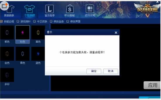问题一:在个性功能中,选择皮肤后,点击应用按钮,提示“个性换肤功能加载失败,请重启程序!” (如下图)