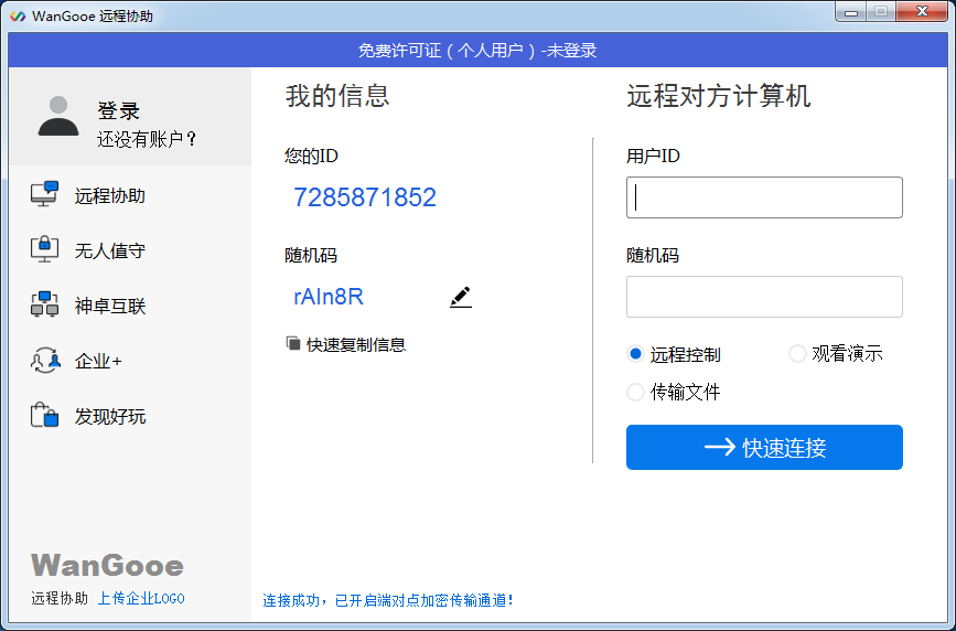 WanGooe远程协助软件依托神卓互联,适用于远程协助、售后支持等场景,依托神卓互联,为广大IT服务提供商以及服务中心专业人员提供免费便捷的远程桌面服务。WanGooe远程操作是款简易方便快捷的远程控制监控软件,画面质量清楚,联接速度更快,适用粘贴板同?i、多屏显示远程控制、屏幕截屏、远程演示、文件快传等企业办公所需作用,只需输入用户ID以及随机码即可开始远程控制。喜欢的朋友欢迎下载使用。