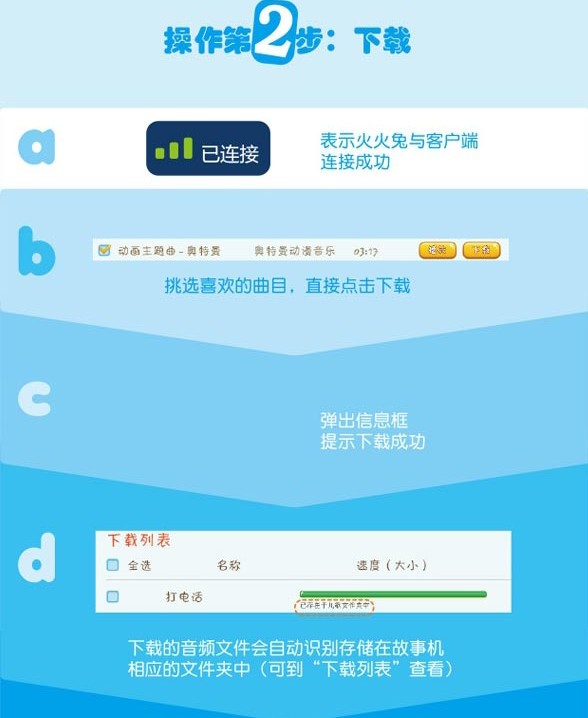 d:下载的音频文件会自动识别存储在故事机相应的文件夹中(可到“下载列表”查看)