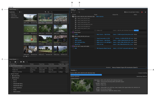 对文件进行编码时,Adobe Media Encoder 中有五个主面板可供使用。您可以将面板作为单帧的选项卡进行分组,或作为单独的浮动面板。
