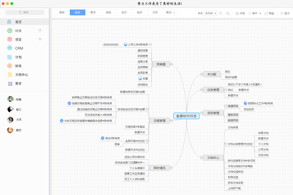 4、项目管理:替代project的协作项目管理工具。脑图(思维导图)快速分拆项目任务,甘特图规划时间,项目成员时时更新进度;软件敏捷开发管理:产品、研发和测试的一体化工具,支持需求、缺陷、版本、迭代管理和功能强大的看板;