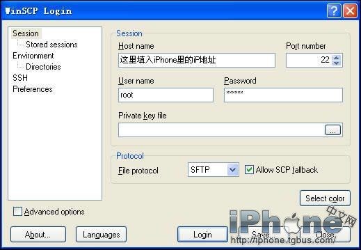 3、重启后,请打开WinSCP,在Host name里填入iPhone的IP地址,User name里填入root ,Password里填入alpine,然后点击Login就可以成功连接上iPhone了。