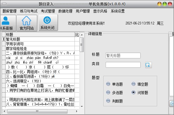 出卷多样化:各种题型设定,类似题目;能导出到word,可对题目使用次数进行统计。