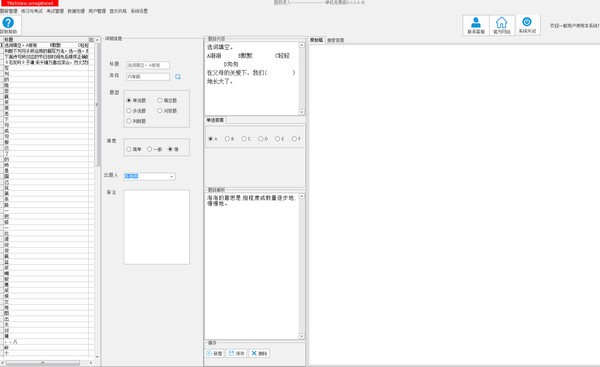 思其道智能题库系统是一种智能题库系统,分为题库管理,试卷管理,用户管理,系统设置,数据处理,风格设置六个子系统。软件使用对象:老师、家长、学校、教育培训机构以及有此需求的其他人员与企业。具有录题快,智能比题,智能出卷,智能练习,智能批卷等功能;并支持多种题库、多级审批。