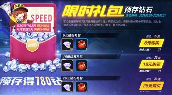 520浪漫预存送海量钻石!在5月20日-5月31日期间,预存跨月直购活动限时开启!在直购当天预存52元,得240钻石,6月1日开始累计登录5天,得540钻石,预存共得780钻石!
