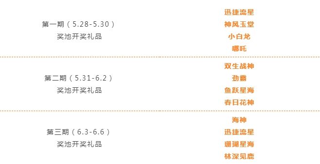 (1)活动时间:第一期5月28日-5月30日,第二期5月31日-6月2日,第三期6月3日-6月6日,每期夺宝,奖池奖励均不同。