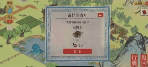 在右上角多了一块迷雾,点击迷雾前的牌坊,然后进入,在第三个房子兑换豆腐干,然后将豆腐干交给奇怪的青年,和奇怪的青年对话,交付20个金圣叹的短评,可以获得人物金圣叹。