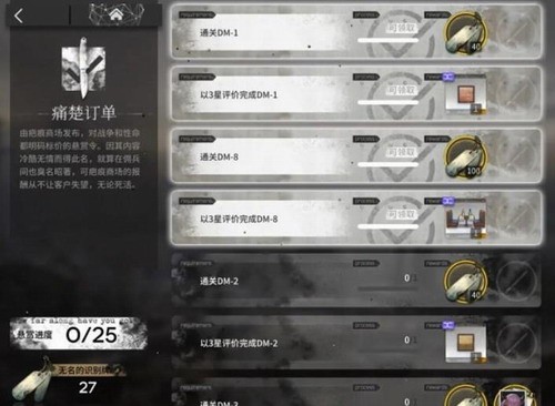 接下来看任务面板「痛楚订单」,能够获取活动干员铸铁。通过这些任务,我们能获取活动代币790枚。同时,首通关卡的任务被重置了,哪怕是之前已经经历过「生于黑夜」的博士,也要把DM-1到DM-8、DM-EX-1至DM-EX-6,以及突袭DM-EX-6都再通一遍。