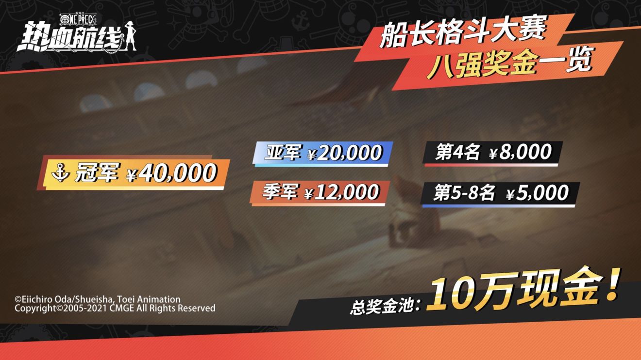罗杰在伟大航线中埋下了令人神往的ONE PIECE宝藏,船长格斗大赛也为获胜的选手准备了丰厚的奖励!前八名选手将瓜分十万赛事奖金!