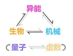 虚数属性与生物、异能、机械三属性无克制关系,与量子属性互相克制又有相似之处,即: