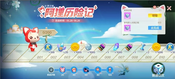 车友们完成每日任务,就可获得相应的骰子,每天可获得三枚哦~领取骰子让小阿狸前进,达到相应步数会有各种丰富奖励!完成100步即可获得阿狸套装,前进吧车友们!