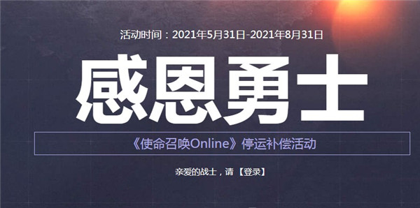 1.《使命召唤Online》由于代理合约即将到期,游戏将于2021年8月31日 12:00正式停止运营。为了感谢战士们的支持与理解,《使命召唤Online》开启该补偿活动。