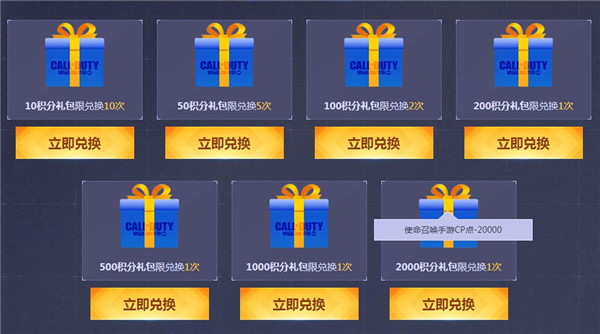 5.活动第三部分,系统将根据您登录活动QQ号对应四个大区角色在《使命召唤Online》中剩余的CP数量,按照1000:10的比例转换成积分,大于0不足1000的部分向上取整。例如,您的剩余CP数量为2222,那么向上取整为3000,您可领取30积分。消耗对应数量的积分,您可以选择兑换相应的礼包,兑换次数不能超过指定的上限,请合理安排积分消耗。