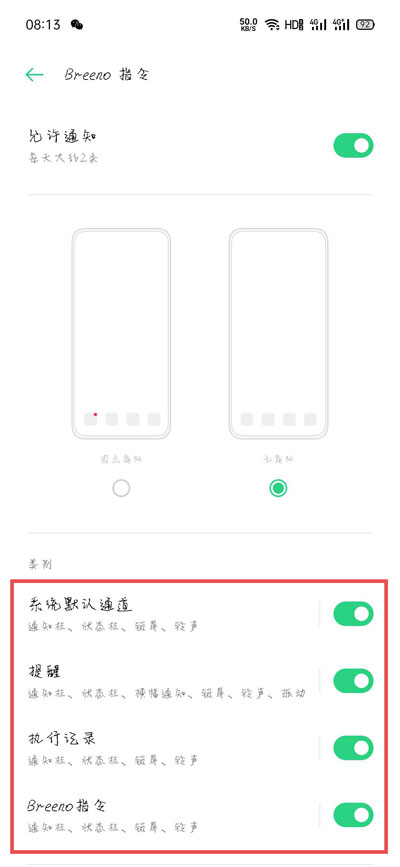 13、在下方类型中,共有几个通知类别,我们需要每个类别都点击进入设置,以Breeno指令为例,点击进入设置;