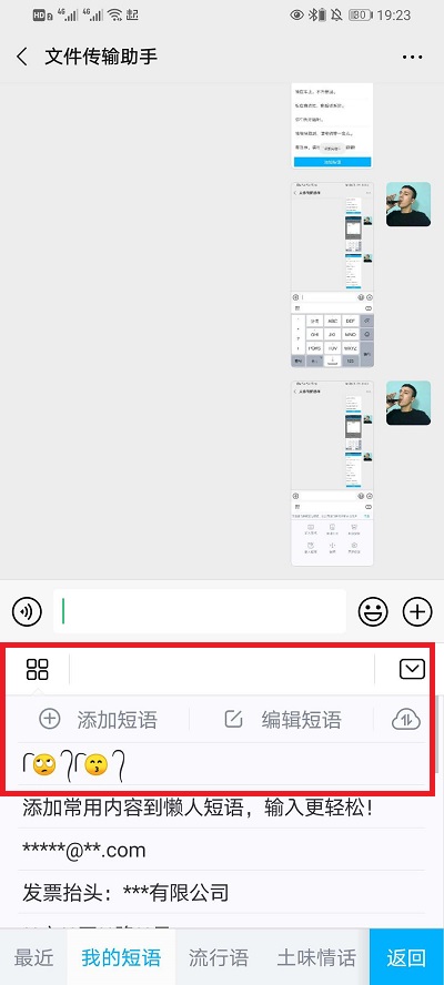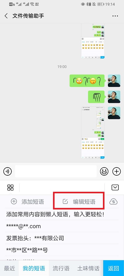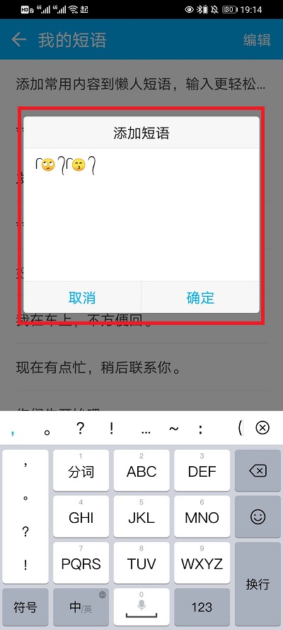 5、保存代码后即可看到代码在短语界面,小伙伴们可以点击懒人短语直接出现在输入框更改表情即可。