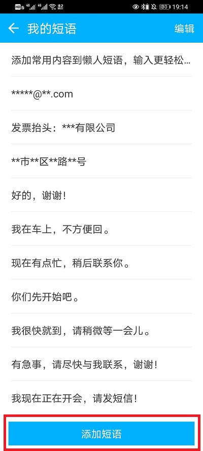 3、在懒人短语界面,点击右上方的编辑短语,进入编辑。