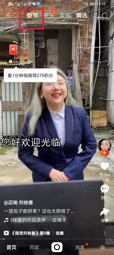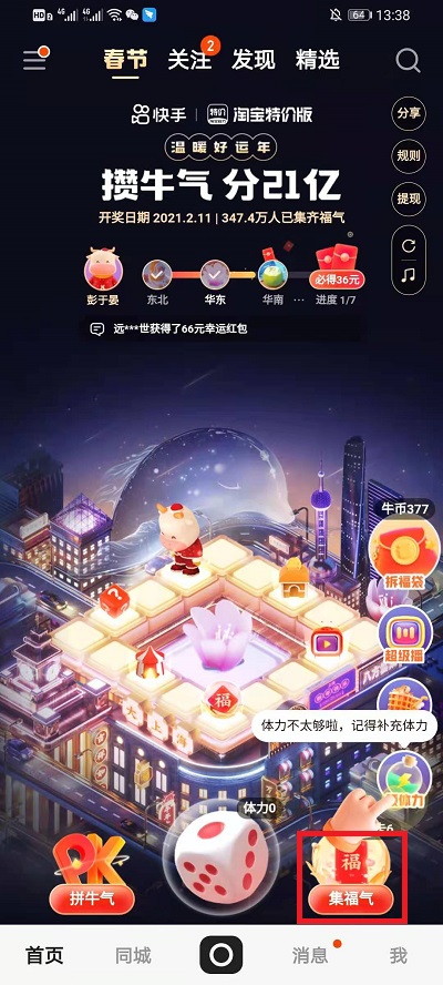1、我们需要点击进入到快手,然后点击界面中左上方的【春节】,然后进入到活动中;