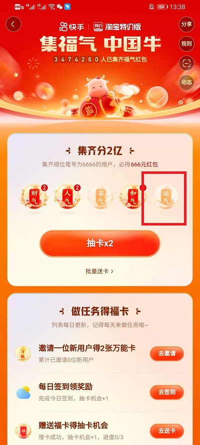 3、在集福气的活动界面中我们点击运气卡然后就可以进入到运气卡分享界面;