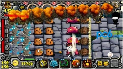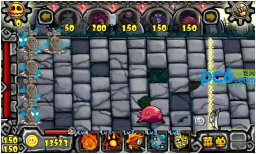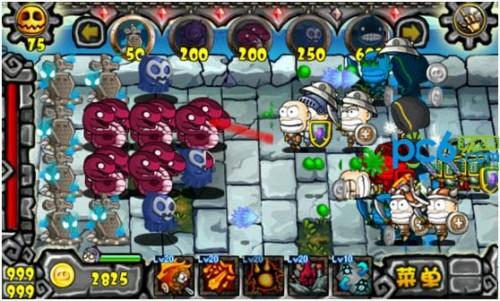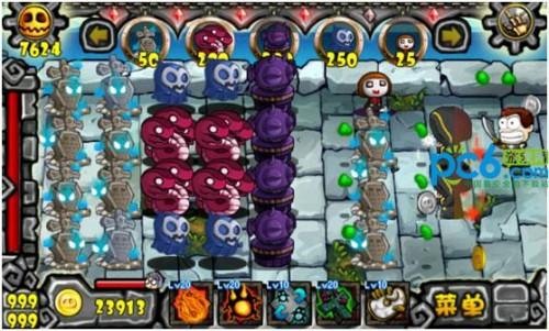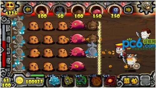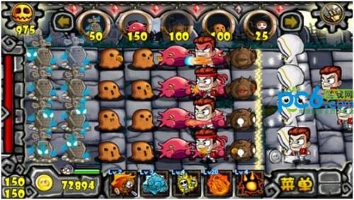 这个场景难度骤然加强,尤其是一开始,很多人发现墓地还来不及放,敌人就出来了。尤其是某些关卡,一开始就会出3个兵,根本来不及挡。这里有两种办法,一种是用那个炸弹娃娃,商店500块的。25灵魂放一个,一开始就墓碑+娃娃。一般敌人出兵的时候能放2个左右。