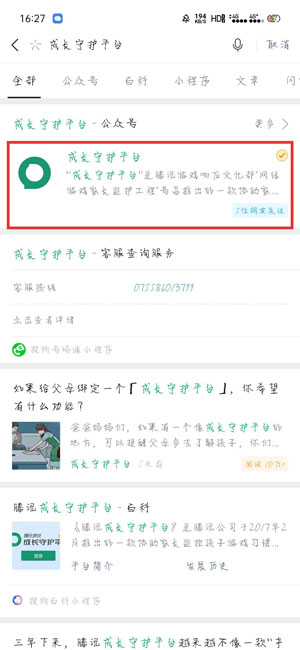 4.打开微信,搜索【成长守护平台】微信公众号,点击关注后进入公众号内;