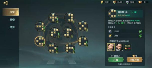 30级前主鱼鳞阵后方圆阵,30级后主方圆阵,长蛇阵,次主力输出系攻击阵,接着战防阵,策防阵,资源有限其他先不升。