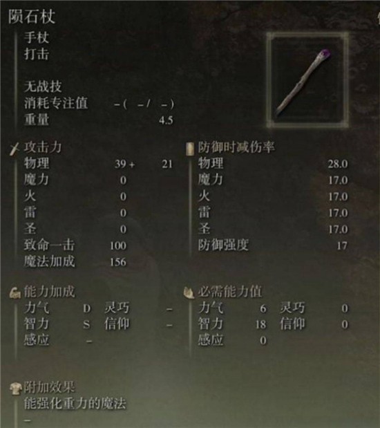 1、前中期玩家使用陨石杖可以提升20%重力魔法伤害、s补正等属性。