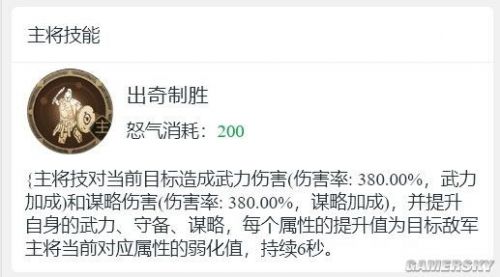 出奇制胜:对当前目标造成武力伤害(伤害率:380%,武力加成)和谋略伤害(伤害率:380%,谋略加成),并提升自身的武力、守备、谋略,每个属性的提升值为目标敌军主将当前对应属性的弱化值,持续6秒。