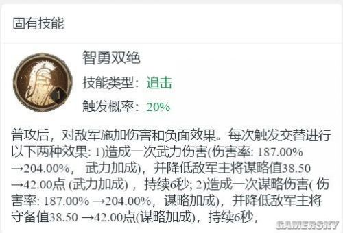 智勇双绝:普攻后,对敌军施加伤害和负面效果。每次触发交替进行以下两种效果:1.造成一次武力伤害(伤害率:187%=>204%,谋略加成),并降低敌军主将守备值38.5点=>42点(谋略加成),持续六秒。