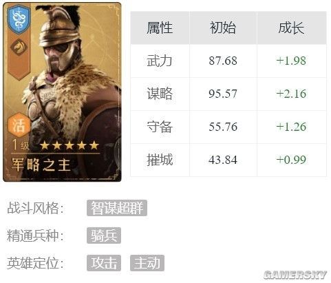 军略之主是目前《重返帝国》属性数据最高的英雄,无论是武力值还是谋略值都是出类拔萃的,因此,军略也有着最自由的配将方式,比如武力骑和谋略骑都是可以考虑的阵容。