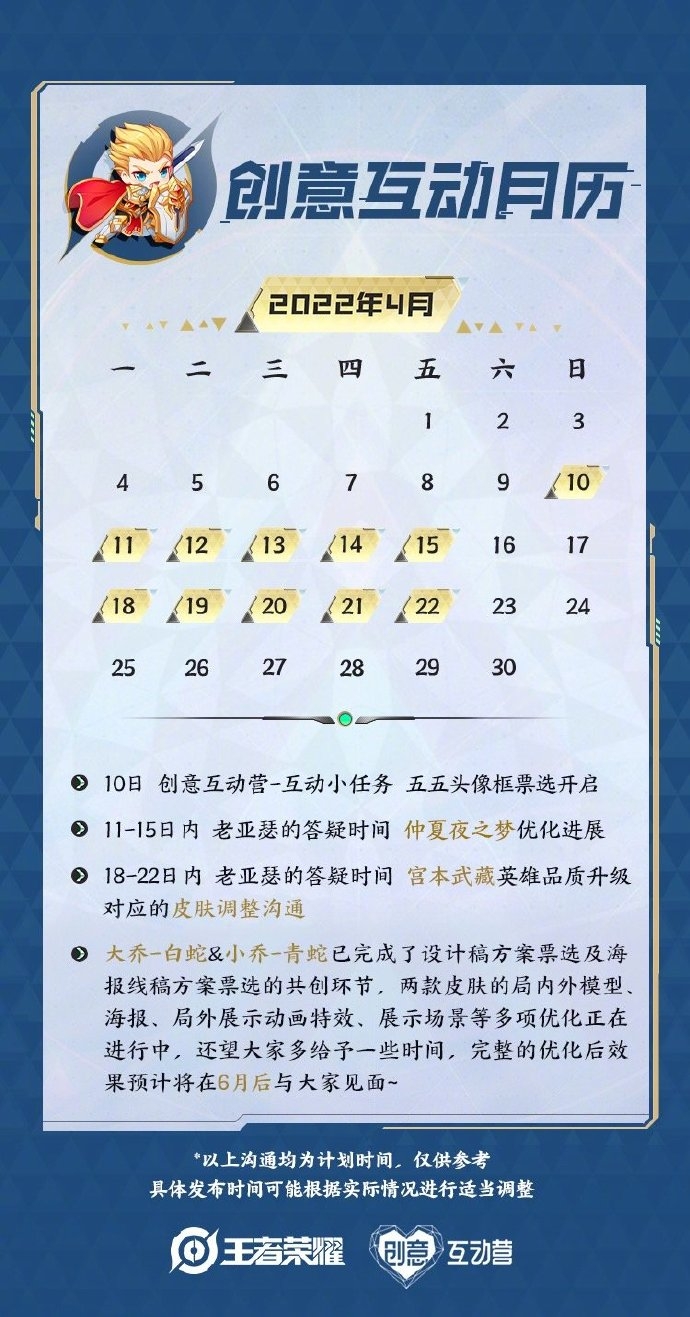 《王者荣耀》4月创意互动月历优化表 皮肤迎来优化