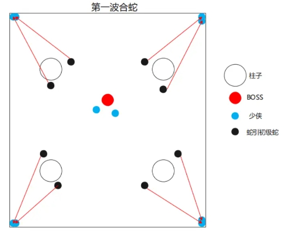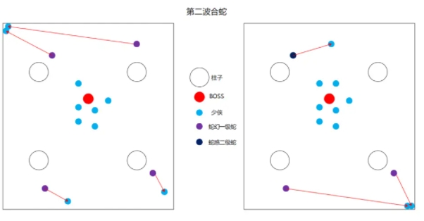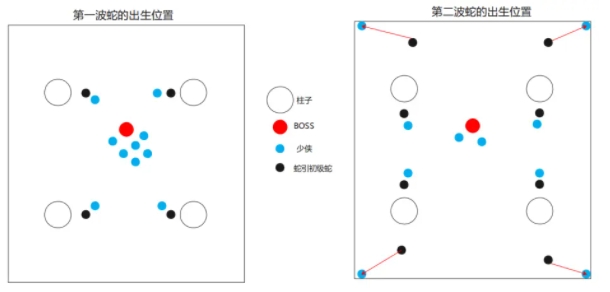 第一波蛇的出生位置在boss面向的前后两侧柱子旁,第二波蛇的出生位置在boss面向的左右两侧柱子旁。